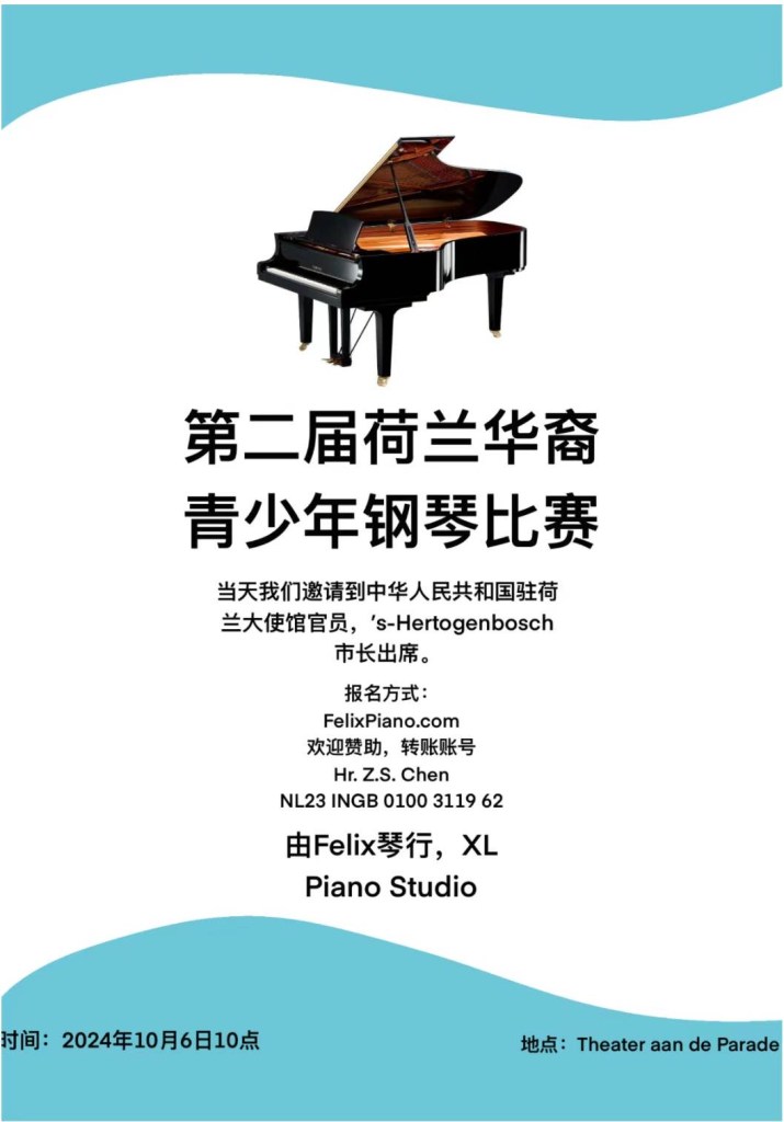 2022年4月我们成功地举办了第一届荷兰华裔青少年钢琴比赛。在众望所归中,第二届荷兰华裔青少年钢琴比赛,由Felix琴行和XL Pianostudio联合主办,决赛将于2024年10月6日在荷兰Den Bosch皇家剧院Theater aan de Parade举行。